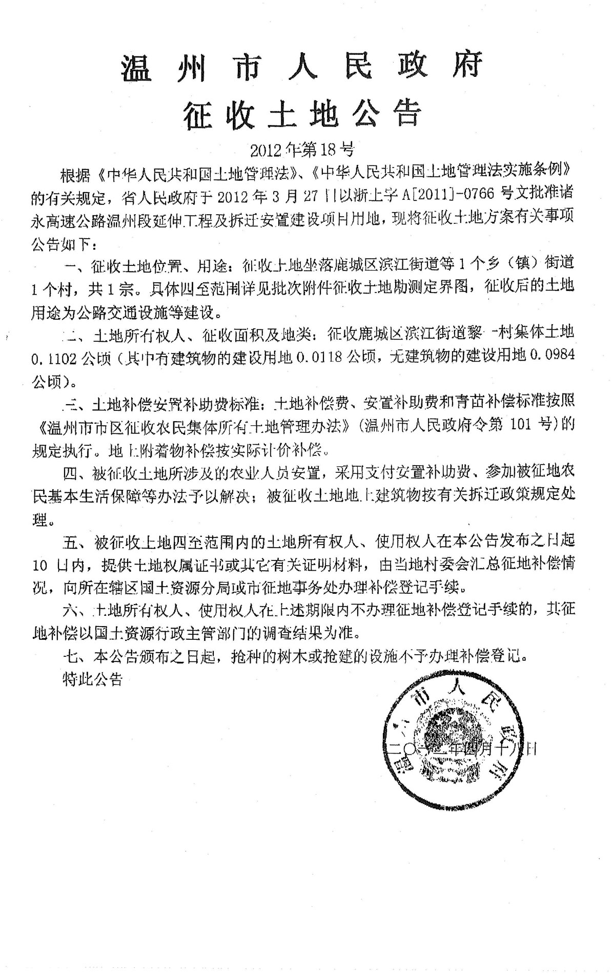 溫州市征收土地公告(2012年第18號)