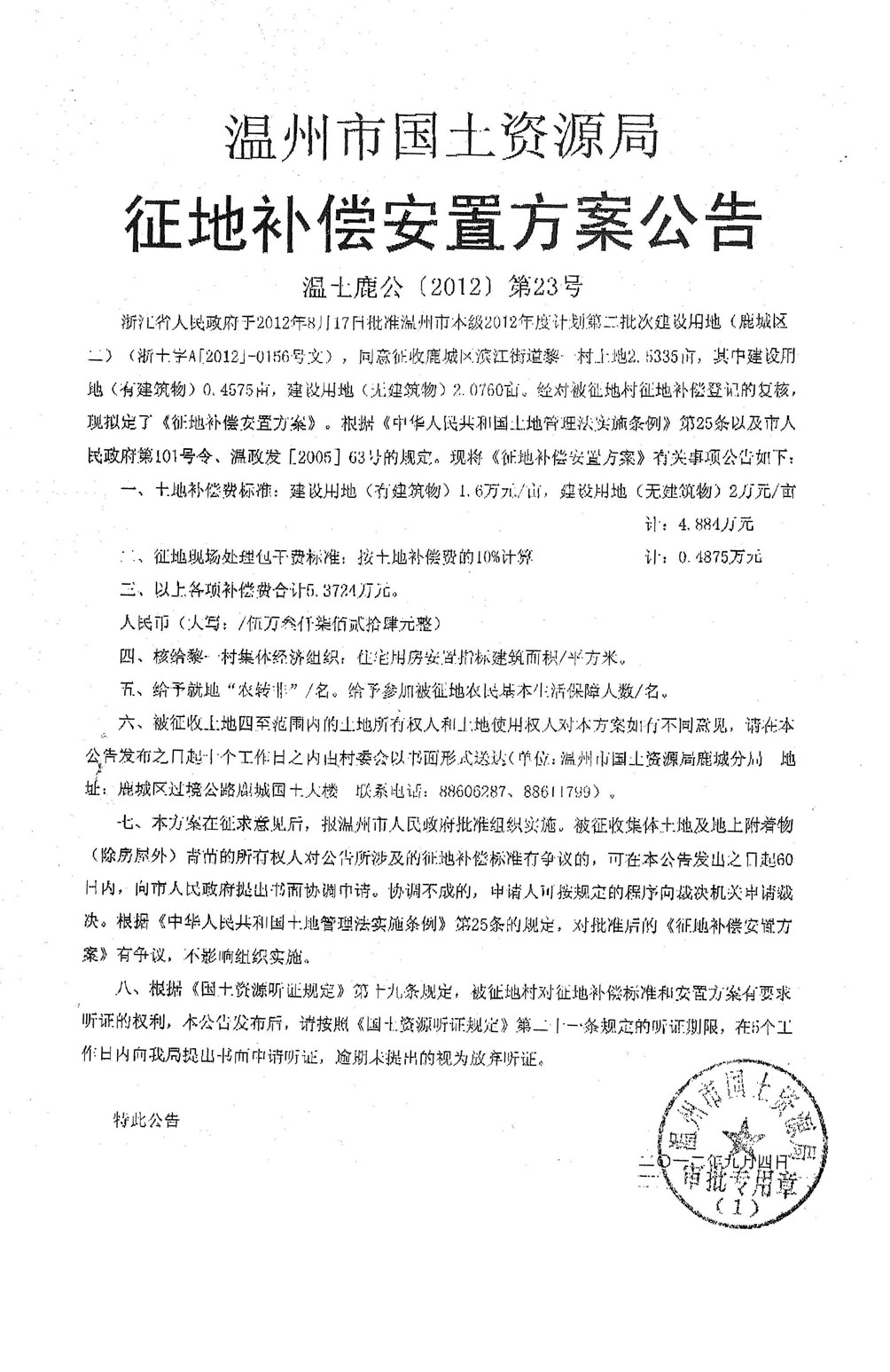 溫州市國土資源局征地補償安置方案公告[溫土鹿公(2012)第23號]