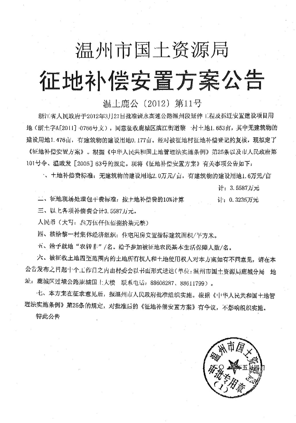 溫州市國(guó)土資源局征地補(bǔ)償安置方案公告[溫上鹿公(2012)第11號(hào)]
